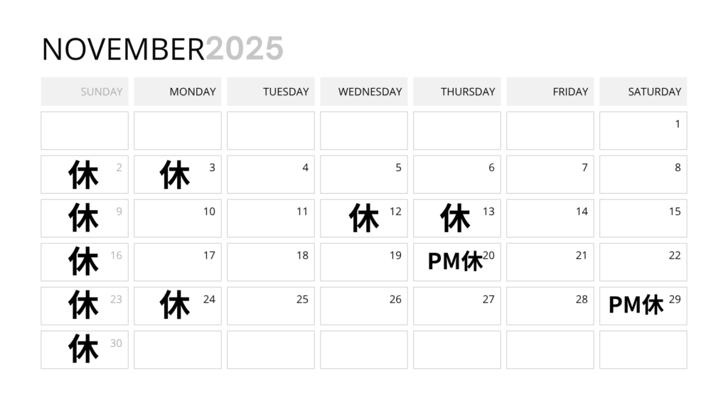 11月スケジュールのお知らせ 2025 10/04 お知らせ 2025年10月4日 日曜・祝日はお休みとなります。12~13日は終日お休み。20日・29日は午後休みとさせていただきます。よろしくお願いいたします。 お知らせ よかったらシェアしてね! URLをコピーする URLをコピーしました! URLをコピーしました! 10月スケジュールのお知らせ 12月スケジュールのお知らせ 関連記事 新規受入状況について【2/10現在】 2026年2月10日 3月スケジュールのお知らせ 2026年2月10日 2月スケジュールのお知らせ 2026年1月11日 1月スケジュールのお知らせ 2025年12月8日 新規受入について【11月10日現在】 2025年11月10日 12月スケジュールのお知らせ 2025年11月10日 10月スケジュールのお知らせ 2025年9月7日 9月スケジュールについて 2025年8月8日